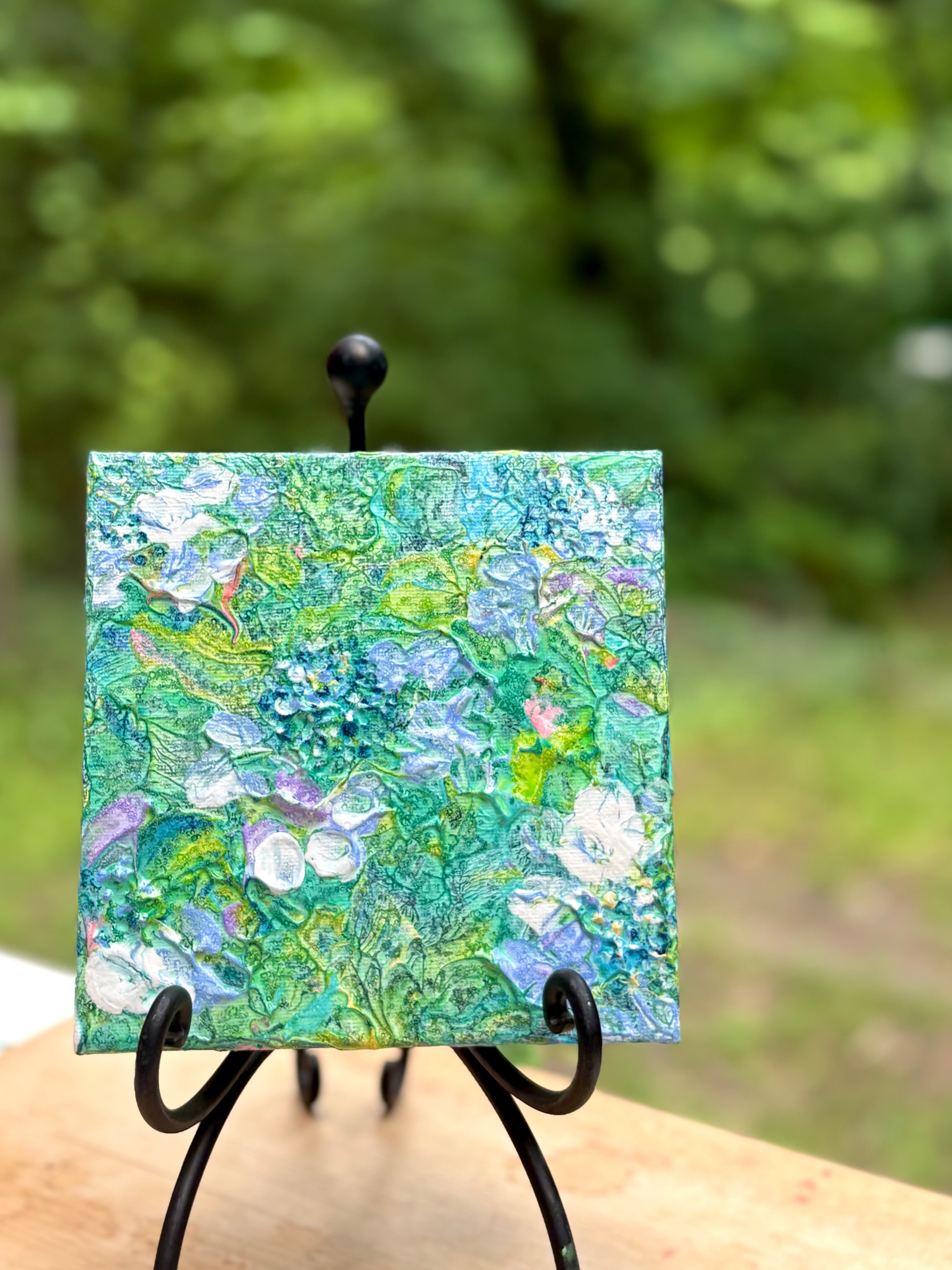 『美しいおかえり』 紫陽花が 庭先で迎えてくれる しあわせ アクリル 2025 絵画サイズ 15cm×15cm×4cm 額サイズ 27cm×27cm×5cm 額装あり